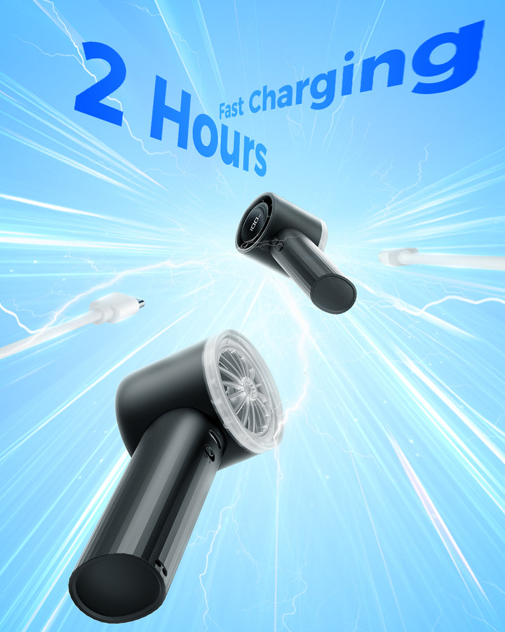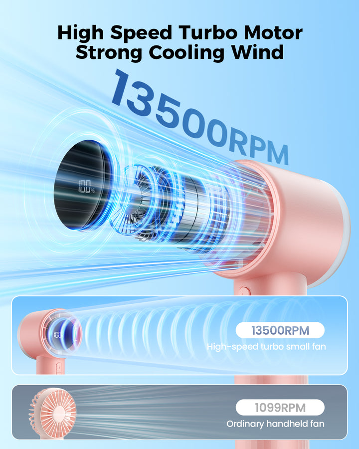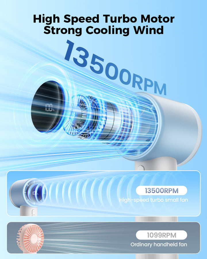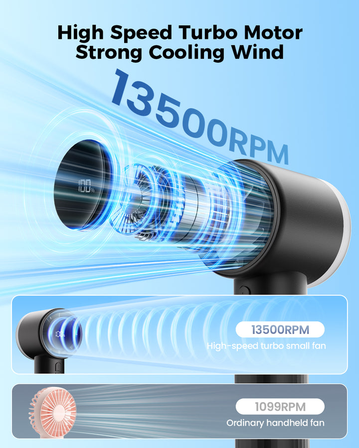 · Speed control feature: Long press to activate the 199th setting (13,000 RPM) for an instant burst of cool air, perfect for overcoming the heat. Short press to adjust between levels 1-5 (0-100 speed) for customizable airflow
