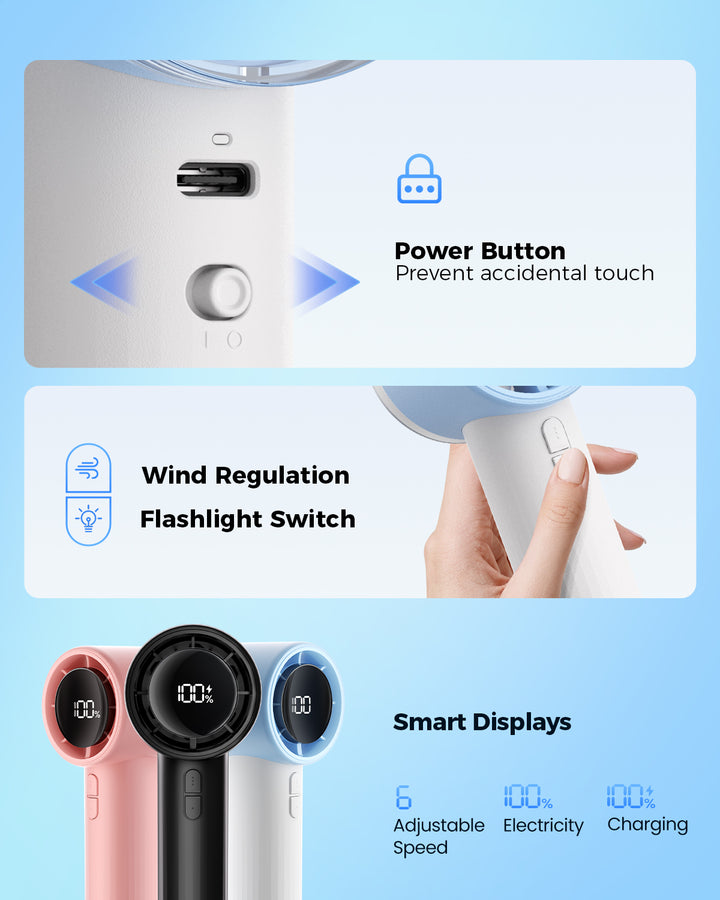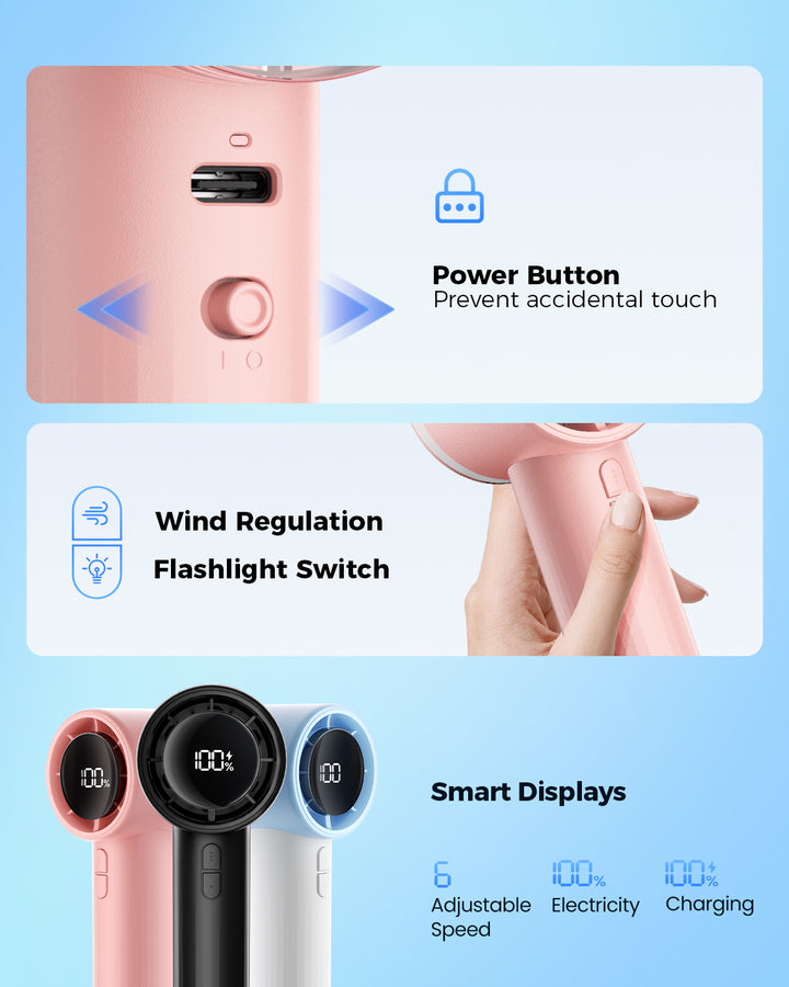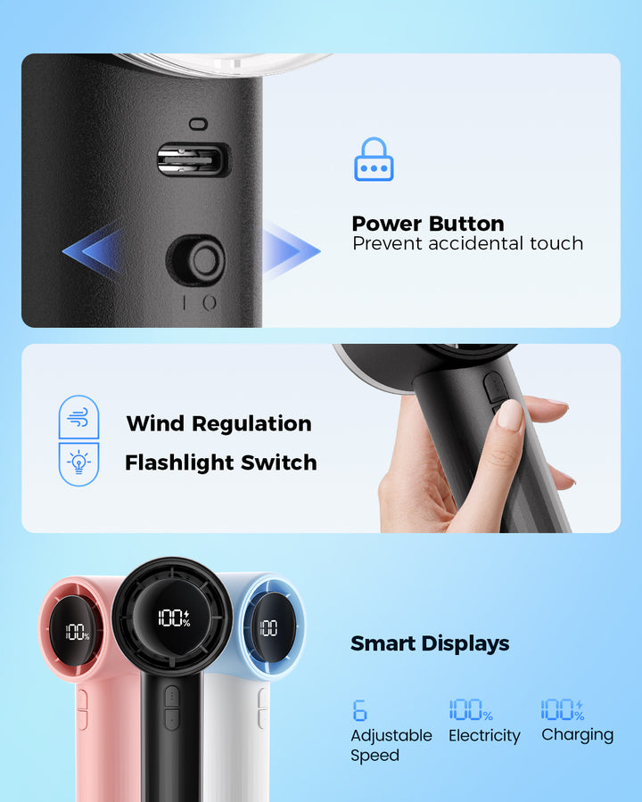 · User-Friendly&LED Display: This fan is user-friendly with one-touch control, offering both long and short press modes. Plus, it features an LED display to easily see the fan speed and remaining battery