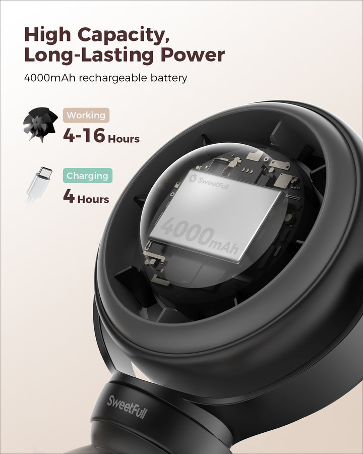 15-Hour Runtime & Fast USB-C Recharge: Enjoy up to 15 hours of cooling with the 4000mAh rechargeable battery. Quick 3-hour USB-C recharge keeps you ready for long trips