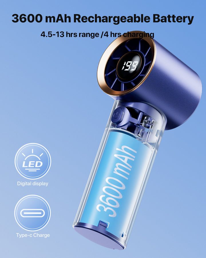 3600mAh rechargeable battery: Long-lasting 4.5-13 hr single charge personal fan keeps you cool all day, perfect for long workdays and outdoor adventures