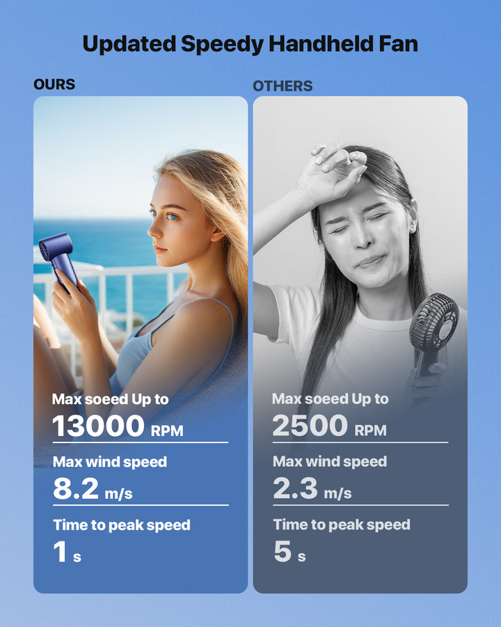 Speed control feature: Long press to activate the 199th setting (13,000 RPM) for an instant burst of cool air, perfect for overcoming the heat. Short press to adjust between levels 1-5 (0-100 speed) for customizable airflow